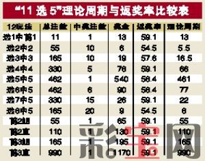 “11选5”属小盘玩法,号码重出的周期短,返奖率高(返奖率59%,比传统彩种的返奖率约高出了10%),最适宜追号投注。对于有过追号经历的彩民来说,做计划时首要考虑的因素是投注的返奖率,还有就是号码的理论周期。周期越短投注计划的可操作性就越强,返奖率越高倍投的风险就越低,成功获利的机会就越大。下面是“11选5”各种玩法理论周期与返奖率的比较表(见表):