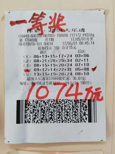 5月1日,第17049期体彩大乐透进行开奖,中奖前区号码为:09 、12 、14、 22、 31;后区号码为:05、 08。当期全国共中11注一等奖,广东彩民揽得8注,其中一注落在广东潮州市饶平县清华路17号19019投注站。