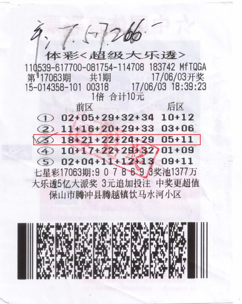 6月3日,大乐透063期开出号码:18、21、22、24、29+05、11,当期全国共开出11注头奖,其中云南彩民揽获2注头奖,分别出自昆明安宁市金方路19号卫校旁体彩销售网点和保山腾冲腾越镇饮马水河小区体彩销售网点。