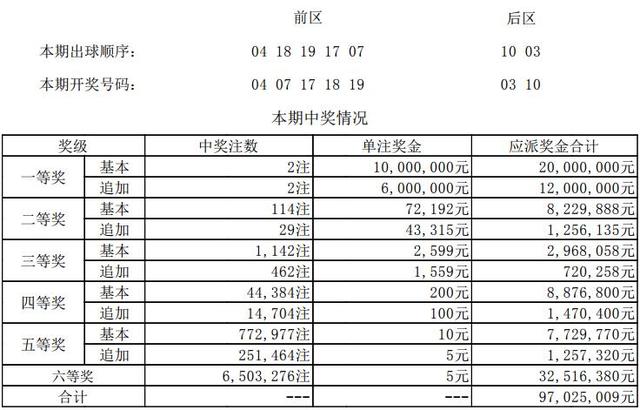 12月11日晚20点30分,中国体育彩票超级大乐透准时进行第17145期开奖直播,本期大乐透开奖号码为:04、07、17、18、19+03、10。