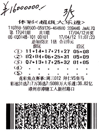 2017年5月1日晚17049期体彩“体彩大乐透 ”开奖,前区号码09、12、14、22、31,后区号码05、08。 6注落在中山市。其中一张中奖票是一张5倍倍投的单式追加倍投票,另一张中奖票为5+3复式追加票,两张中奖票均为一人所得。