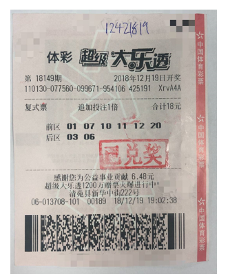 2018年12月24日,河北保定一位幸运男子在妻子的陪同下,现身省体彩中心领走大乐透1242万元大奖。