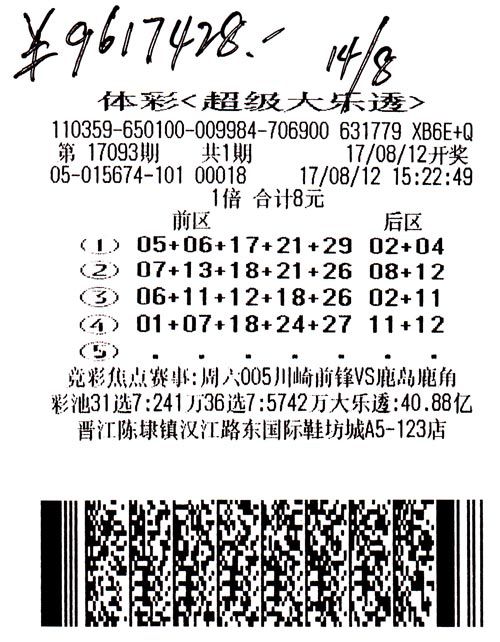 8月12日,第17093期超级大乐透进行,当期泉州一彩民在泉州晋江陈埭镇汉江路东国际鞋坊城A5-123店15674站购买的一张大乐透彩票,幸运中得大乐透头奖961万。