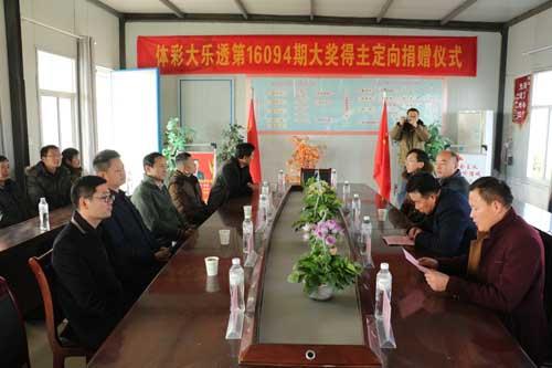 2016年12月2日上午,体彩大乐透第16094期大奖得主定向捐赠仪式在宿州市埇桥区青山初级中学举行,捐赠的15万元将用于该校的操场改造工程。安徽省体彩中心、宿州市教体局、区教体局及市体彩中心的相关领导出席了捐赠仪式。