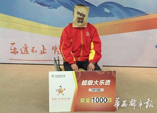 9月19日上午,这位幸运的彩民来到四川省体育彩票管理中心兑奖大厅,他前来兑超级大乐透第16109期的大奖,领取奖金1068.5574万元。这位彩民戴上“七筒”面罩,穿上红火的体彩外套,全幅武装后领走了属于他的这份幸运大奖。