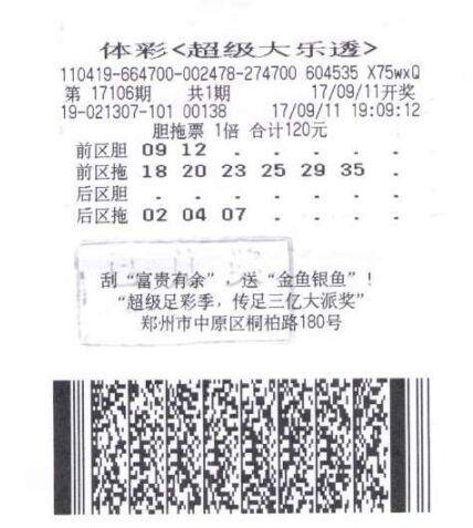 9月11日,第17106期超级大乐透进行开奖,河南彩民在当期开奖大乐透中中得1注头奖,中奖地点位于桐柏路市场街南100米路西的第4119021307体彩网店,中奖彩票是一张120元投入的前区2胆6拖后区3码的胆拖票,计奖后单张彩票中得1032万。