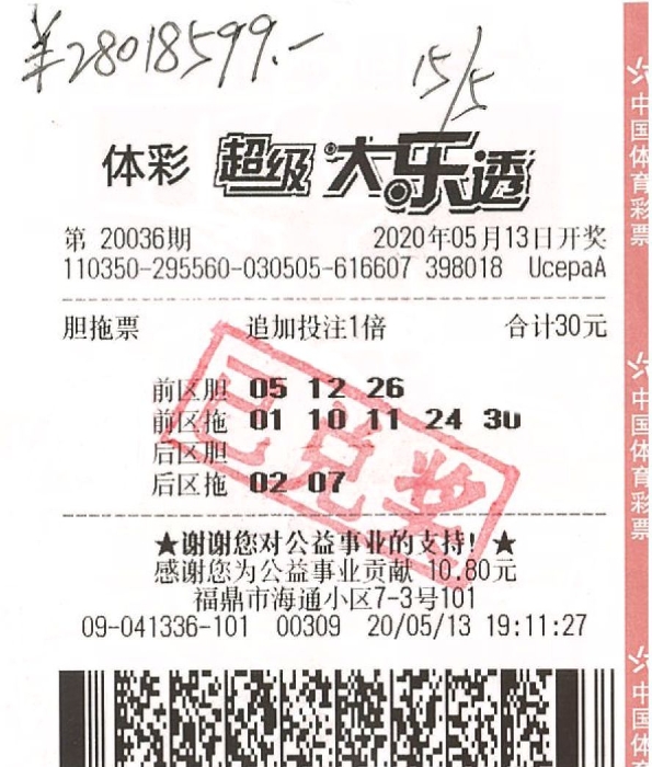 在体彩大乐透第20036期开奖中,福建宁德福鼎市购彩者张先生凭借一张“前区3胆5拖+后区2拖”的30元胆拖追加票
