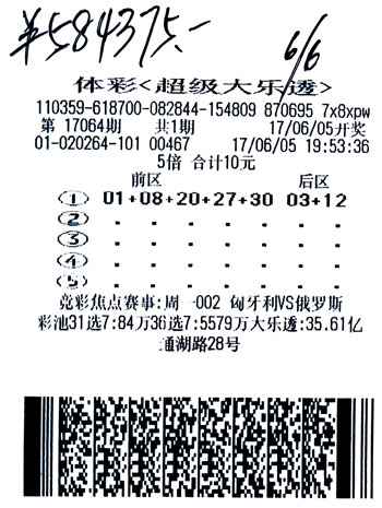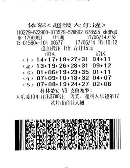 2017年6月14日,第17068期体彩超级大乐透开奖,当期开出号码:07 08 19 24 27 06 07。其中,来自吉林延边的张女士喜中1注二等奖,奖金10.2万余元;长春彩友刘先生喜中50注三等奖,收获奖金13万余元。