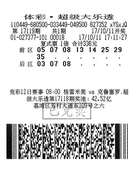 10月11日晚,第17119期体彩超级大乐透开出中奖号码:05、07、13、29、35+03、08。当期共中出5注大乐透头奖,基本奖金为829万多元。当期,广州一彩民以一张336元投入的“8+3”票,揽下1注头奖、2注二等奖。