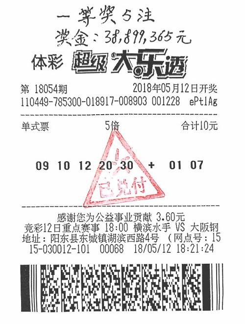 5月12日,体彩大乐透 第18054期井喷13注头奖,其中阳江彩民揽得5注777万元(含116万元派奖奖金)基本头奖,共计3889万元,刷新了当地彩票市场的最高中奖纪录。