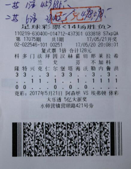 5月21日,足彩胜负彩14场第17075期进行开奖,当期全国头奖开出26注,单注奖金为45.9万元;二等奖开出800注,单注奖金为6402元。来自辽宁大连市彩民幸运在当期一人独揽一等奖1注、二等奖6注,收获奖金高达49.8万元。