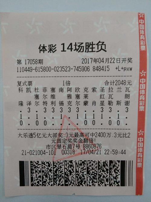 4月24日上午,在云浮市云城区翠石路的体彩21004网点,老彩民李先生购买第17058期14场胜负彩,以一张2048元的复式票喜中大奖228万多元。