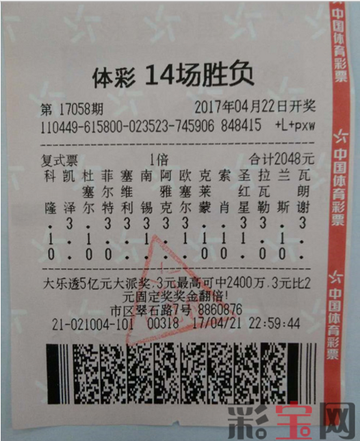 2017年4月24日上午,在云浮市云城区翠石路的体彩21004网点,老彩民李先生购买第17058期14场胜负彩,以一张2048元的复式票喜中大奖228万多元。