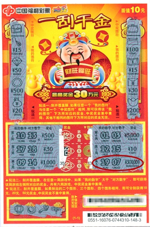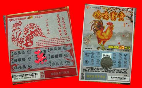 2017年第一款刮刮乐新票“丁酉鸡”惊喜上市啦!“丁酉鸡”有三款面值不同的彩票,分别是5元、10元和20元,头奖也分为10万元、30万元和100万元,该票一上市便受到了广大彩友的追捧。