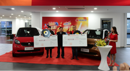 温州和湖州两彩民与奔驰车幸运相“撞”。11月23日,这两位幸运者来到杭州,浙江省福彩中心党委副书记、纪委书记吕伟加将“福彩刮刮乐、好运奔驰来”喜从天降第2期的奖品——奔驰Smart汽车(钥匙)和5万元现金支票送到了这两位幸运彩民的手中。