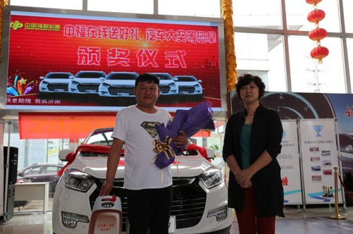 6月6日,空中细雨绵绵,然而这却不影响位于长沙路的青岛圣豪江淮4s店喜气洋洋的气氛。据了解,青岛福彩“中福在线送好礼 汽车大奖等您拿”活动的颁奖仪式在此隆重举行。市民袁先生(化名)和他的朋友喜获一辆价值十多万的江淮第二代瑞风S5。