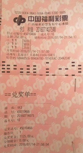 7月14日,北海市广东路桐洋国际104号铺面福彩第45010466号投注站有一位老彩民,在“快3”20160714075期看准和值“11”,果敢倍投125倍,喜中1125元奖金。
