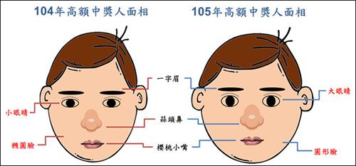 21日,台湾彩券公司公布今年中奖金额在500万元新台币的高额中奖人的面相特征,发现有圆形脸、大眼睛、一字眉、蒜头鼻、樱桃小嘴等面相特征的人,中大奖的机率较高,且以男性居多。