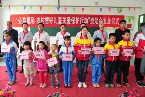 5月24日,由陕西省民政厅、省财政厅、团省委和省福彩中心联合开展的“公益福彩·农村留守儿童关爱保护行动”在西安市周至县九峰镇中心小学举行了简朴的资助金发放仪式。