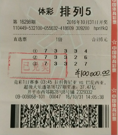 10月31日,排列5第16255期开奖号码为“73326”,来自江门开平市西郊路28号的09058网点彩民凭借一张6元的单式票中得排列5大奖10万元。