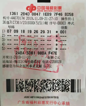 11月10日晚,中国福利彩票36选7第2019300期开奖。据悉,当期广东全省仅中出一注一等奖,花落梅州市。