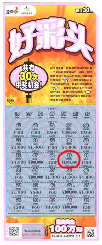 7月12日一早,小李朋友的陪同下,一起来到河南省体彩中心领取了顶呱刮100万元大奖,中奖彩票出自顶呱刮“好彩头”玩法,票面金额30元。