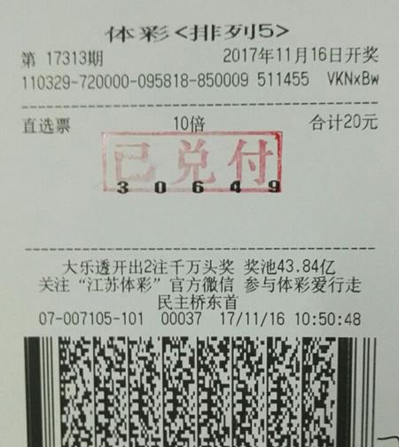 最近,来自江苏无锡的唐先生现身江苏体彩中心,在办理兑奖手续后领走排列五350万大奖奖金。