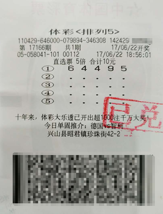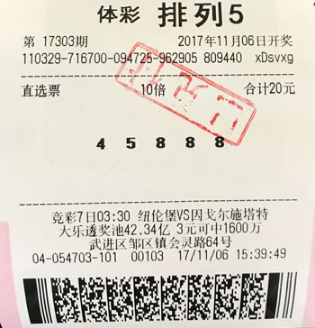 11月6日晚,体育彩票排列五玩法进行第17303期开奖,当期开出中奖号码:4、5、8、8、8,当期开出74注排列五头奖,单注奖金10万元。其中10注花落常州,诞生出新的百万大奖得主。