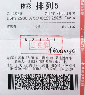 12月25日下午,彩民贺先生满面红光来到湖北省体彩中心,在办理兑奖手续后领取了排列五第17349期50万元奖金。