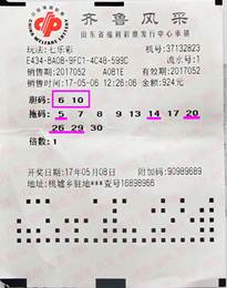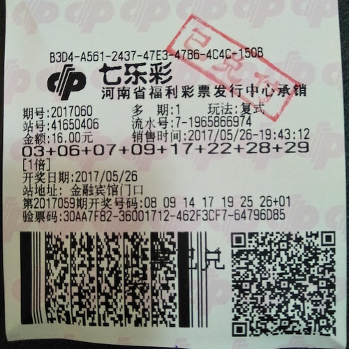 5月26日晚上,福彩七乐彩2017060期开奖,当期开出号码为:03、 06、 07、 09、 17、22、29,特别号码13。当期全国共中出一等奖一注,单注奖金高达134万,该注一等奖花落河南固始,这注出自河南省固始县金融宾馆41650406投注站。