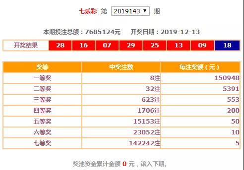 12月13日,中国福利彩票七乐彩游戏进行第2019143期开奖,当期开出的基本号码为07、09、13、16、25、28、29,特别号为18,头奖开出8注,其中上海1注。