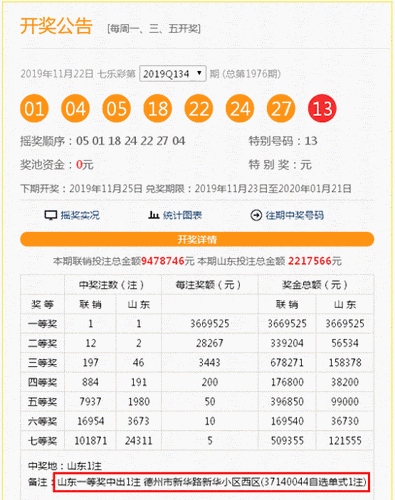 2018年10月12日,七乐彩第2018120期开出一等奖一注,大奖花落河南省南阳市方城县北环路东41630715号投注站,一等奖单注奖金额3561450元。
