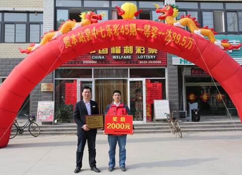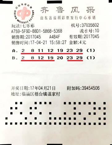4月21日,七乐彩第2017045期开奖,当期,来自淄博的李先生(化名)用4元零钱换中了1注895523元的一等奖和1注1772元的三等奖,瞬间让财富上涨224323倍。