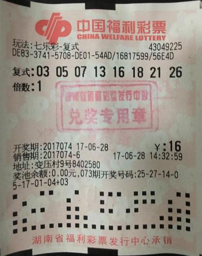 6月28日,第2017074期福彩七乐彩开奖,开出号码:03、05、07、13、16、18、21,特殊号码15。这样一组幸运号码为湖南省彩市添得一注一等奖,单注奖金为711860元,中奖彩票出自衡阳市雁峰区变压村9号43049225站。