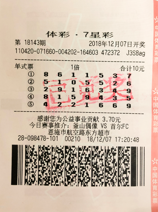 3月10日,体彩七星彩第17027期开奖,全国共中出一等奖3注,其中一注花落黄冈39106体彩销售点,奖金500万元。该奖项已经是11天内湖北彩民夺取的第4注七星彩500万大奖(2月28日十堰彩民中得2注500万元,3月5日十堰彩民中得500万大奖)。
