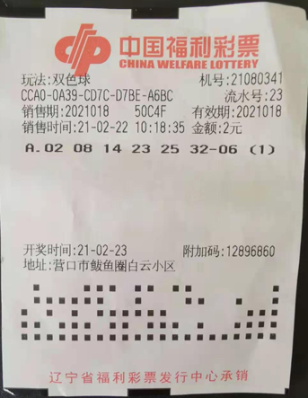 2月23日晚,双色球第2021018期开奖,当期开出红球号码02、08、14、23、25、32,蓝球号码06。在此次开奖中,辽宁省营口市位于鲅鱼圈白云小区的341号福彩站爆出当期一等奖,单注奖金1000万元!