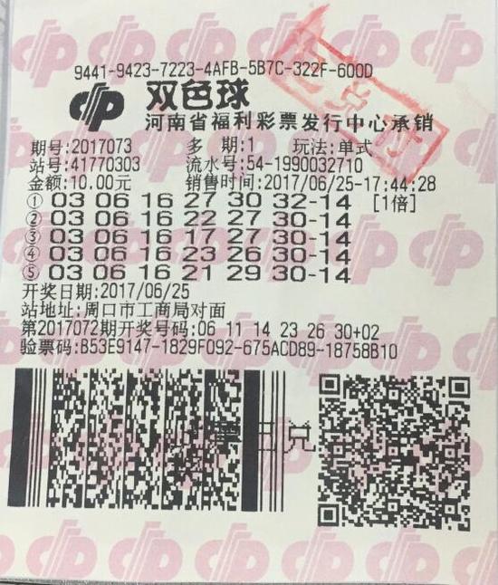6月25日,第2017073期福彩双色球开出9注一等奖,当期开奖号码为:03、06、16、23、26、30+14,全国共开出9注一等奖,其中河南揽入1注,周口彩民通过机选单式投注,以一张彩票投注金额10元,奖金高达709万元,这也是今年周口彩民第二次次获得双色球一等奖。