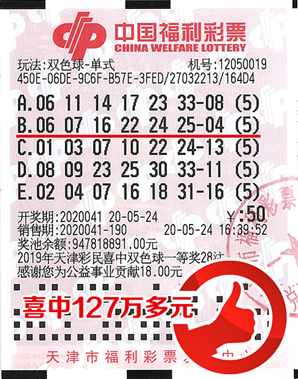 在双色球2020041期开奖中,天津购彩者共中取了6注25万多元的二等奖,其中5注为一人所得,累计中奖奖金127万多元。
