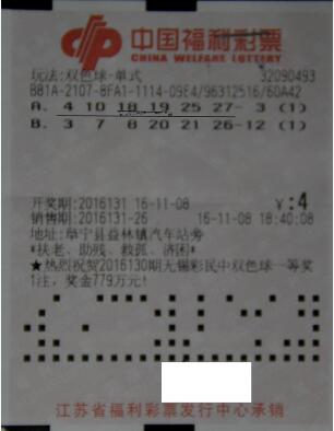 2016131期双色球开奖号是4、10、18、19、25、27+2.在阜宁某企业做工的80后小伙子因没采纳福彩站点站主的建议,和一等奖与“9亿元加奖”的500万失之交臂。
