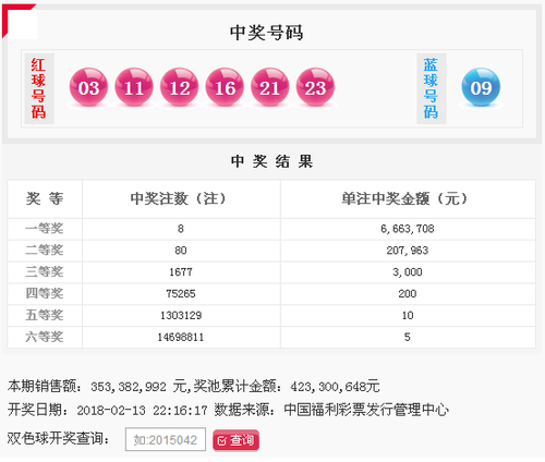 2月13日晚,中国福利彩票双色球第2018019期开奖,头奖8注666万 花落7地