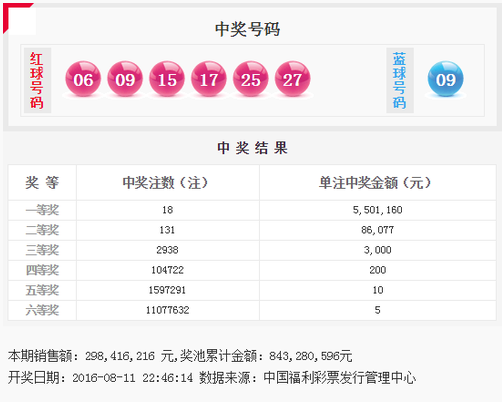 8月11日晚,第2016093期中国福利彩票双色球开奖。当期开出的红球为06、09、15、17、25、27,蓝球为09。