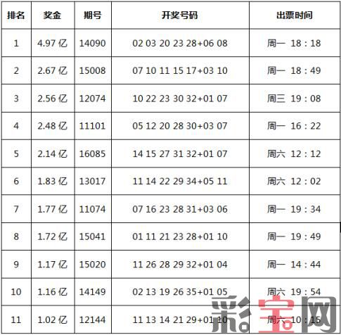 在大乐透迄今为止的11个亿元巨奖中,有6个是在周一开出,占比超过半数,大乐透中奖金额中排名前二的4.97亿和2.67亿,也都是在周一当天开出。巨奖数排第二的是周六,共开出过4个亿元巨奖,包括昨晚的江苏2.14亿元;周三看来最受冷淡,11个巨奖中仅有1个出现在这天,似乎有些被遗忘的感觉。另外在具体时间上,有6个亿元巨奖的出票时间都在18点至20点之间,这也成为最易中出巨奖的时间段。下午6:00过后很多人都已经下班,这一时间段也成为彩票售卖的高峰时间段,彩票店的人流量更高,出巨奖的可能性自然也更大。