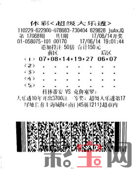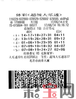 2017年6月14日,第17068期体彩超级大乐透开奖,当期开出号码:07 08 19 24 27 06 07。其中,来自吉林延边的张女士喜中1注二等奖,奖金10.2万余元;长春彩友刘先生喜中50注三等奖,收获奖金13万余元。