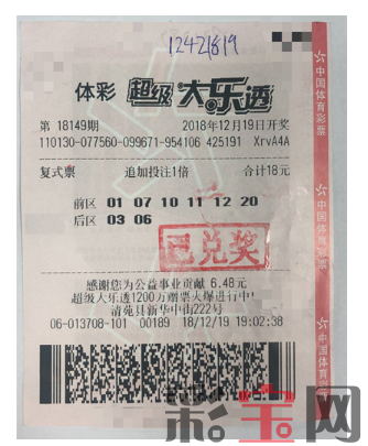 2018年12月19日,在体彩大乐透 第18149期开奖中,该幸运男子凭借一张6+2复式追加票,拿下1注1239万元追加投注一等奖及小奖若干注,合计收获奖金1242万元。