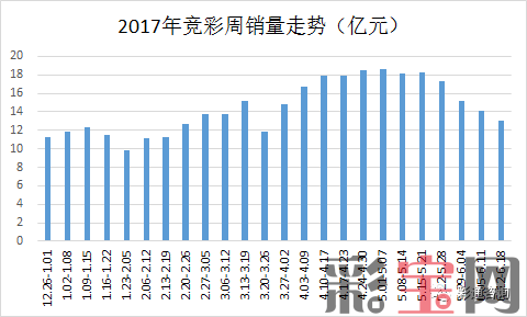 6月12日至6月18日,在这一周的时间内,竞彩销售12.99亿元,环比前一周减少1.12亿元,环比下降8.0%。这是竞彩周销量连续第4周下降,也是自3月底以来竞彩周销量首次降至13亿元以下。