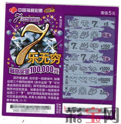 据了解,“7乐无穷”面值5元,最高奖金10万元,彩民刮开覆盖膜,在任意一局游戏中,如果出现三个相同的图符(其中出现7可代表该局的任意图符),即可获得该局游戏右侧所对应的奖金。共有七局游戏,中奖奖金兼中兼得。