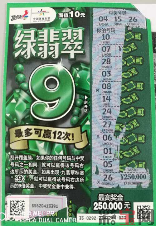 据小伙介绍,自己最喜爱的彩票玩法就是体彩的顶呱刮,因为顶呱刮即买即开,即中即兑、简单好玩。小伙几乎有时间就会去位于绿园区荣鼎康城4栋3门的02999即开销售网点刮上几张,每次不多,大概就是20元左右,中了就中了,不中也就收手了。就这样坚持了有一年了, 变成了自己的一个小爱好,时常刮几张碰碰运气。那一天,小伙又来到该网点,要了两张自己比较喜欢的“绿翡翠”,刮了起来,在刮到最后一个数字之前,小伙认为这张票肯定是没中奖了,但没想到的是,这最后一个数字就是中奖号码,而号码之后对应的奖金是“250,000”元,这让小伙着实吃了一惊,因为之前刮“绿翡翠”最多也就中过900元,这直接中个头奖是怎么也没想到的。