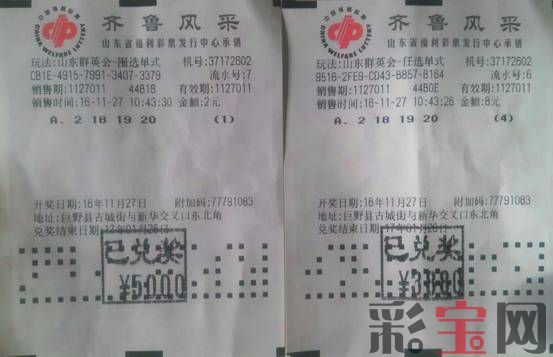 11月27日,在山东省菏泽市巨野县37172602号投注站福彩一彩友任四围四中得 “群英会”游戏第1127011期奖金8880元。