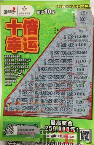 10元面值“十倍幸运”游戏规则:刮开覆盖膜,如果在任何一场游戏中的任何号码与中奖号码相同,即中得该场游戏所示的金额;如果出现双鱼标志,即中得该场游戏所示的金额的十倍。中奖奖金兼中兼得。