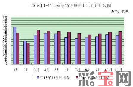 11月份,全国共销售彩票344.82亿元,比上年同期(简称“同比”)增加38.52亿元,增长12.6%。其中,福利彩票机构销售178.61亿元,同比增加8.39亿元,增长4.9%;体育彩票机构销售166.21亿元,同比增加30.13亿元,增长22.1%。